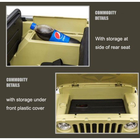 - Almacenamiento en el capó y a los lados de la parte trasera del coche eléctrico para niños.