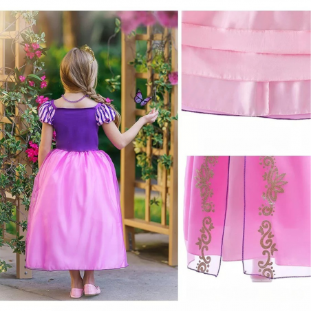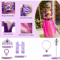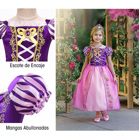 Confeccionado con telas de alta calidad, este disfraz de Rapunzel está diseñado para brillar con luz propia. Su vestido incluye detalles como mangas abullonadas, lazo con pedrería y motivos brillantes, aportando un toque real y elegante. Disponible en tallas desde 3 hasta 9 años, es la opción perfecta para que cualquier niña deslumbre en una fiesta de disfraces. ¡Elige el suyo y haz que se convierta en la princesa más radiante del reino! ✨