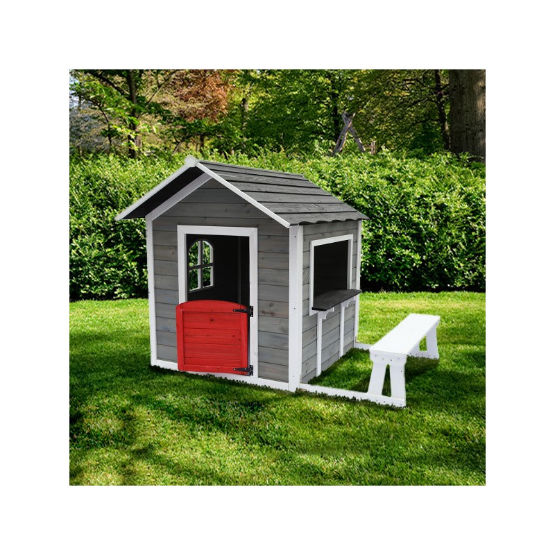 Esta casita de juegos en madera tratada y con la certificación de FSC, incluye un gran ventanal con mostrador y una ventana más pequeña, una puerta a media altura y un banco exterior con el que los pequeños podrán montan sus picnics y meriendas favoritas. La casita infantil Tolem lleva un tratamiento con pintura impermeable y no tóxica en gris, rojo y blanco, preparada para su uso exterior.
