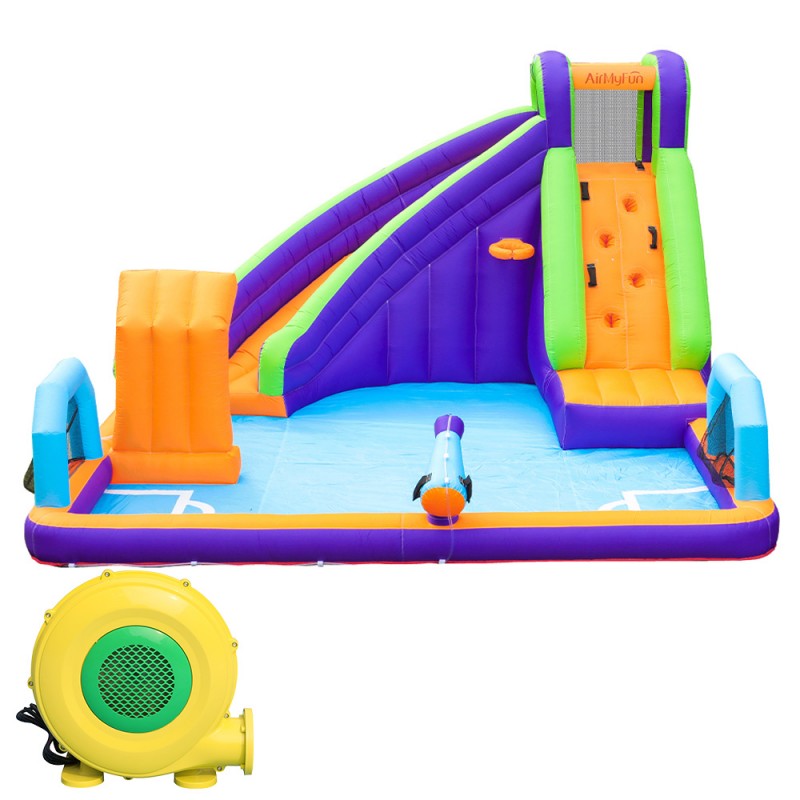 El impresionante castillo acuático Goal está equipado con todo lo necesario para ofrecer diversión a los más pequeños. Entre sus componentes se encuentran una canasta y dos porterías para jugar a los deportes favoritos dentro del agua. Este castillo acuático hinchable cuenta con un gran tobogán para disfrutar de emocionantes descensos hacia la piscina.