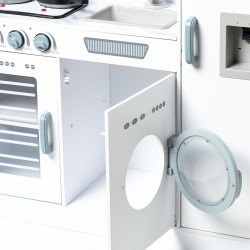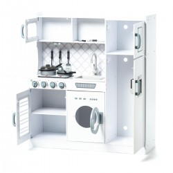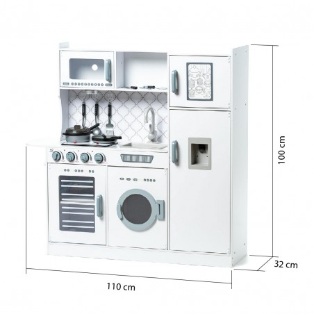 La cocina de madera infantil 100x32x110 cm presenta un diseño clásico que recuerda a una cocina real. Está fabricada en madera de la mejor calidad y es muy resistente. Presenta bordes redondeados y su decoración es sencilla y minimalista, hecha con materiales no-tóxicos. Esta cocina de madera para niños y niñas cuenta con electrodomésticos de imitación, hechos de madera como un microondas, un horno acristalado, una lavadora, un congelador y una nevera con dispensador de agua que emite sonidos y luces, simulando su función. Además, esta cocinita para niños cuenta con dos fogones (que también cuentan con luz y sonidos al girar los botones del horno) y un fregadero. Este es un juguete muy educativo que ayuda a los más pequeños a desarrollar su creatividad. ¡A los niños y niñas les encanta jugar con esta cocina de madera para niños tan divertida!