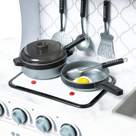 - Dispone de varios accesorios de plástico: dos ollas, cucharón, cuchara para servir, espátula, dos cuchillos, espátula con huevo frito, y otros utensilios de cocina.