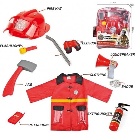 • Inclui: Jaqueta + Distintivo + Capacete + Mochila + Megafone + Machado + Extintor de Incêndio Funcionando + Apito + Relógio + Walkie Talkie + Bússola + Lanterna + Binóculos + Pé de Cabra