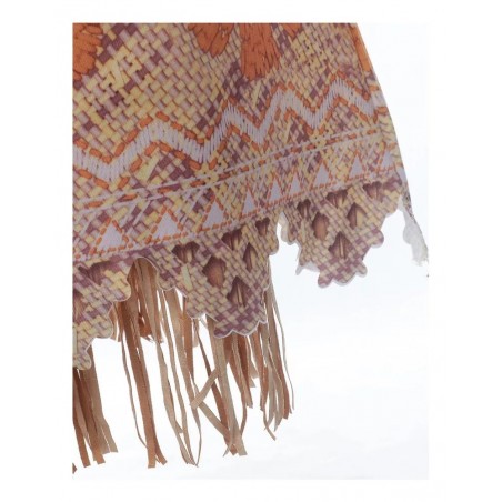 • Inclui: Saia com motivos estampados e franjas + top sem mangas + cinto tipo cachecol + colar com pedra azul