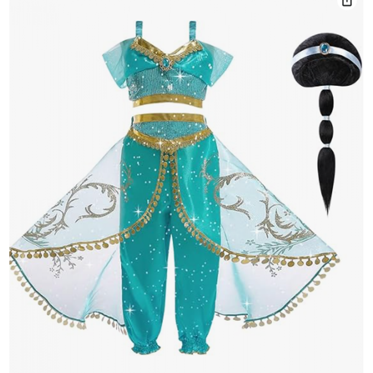 Transporte seu pequeno para um mundo de contos de fadas com esta espetacular fantasia da Princesa Jasmine . Com sua cor esmeralda, detalhes brilhantes, véus esvoaçantes e peruca incluída , esta fantasia recria o charme das Mil e Uma Noites , transformando qualquer garota em uma princesa verdadeiramente corajosa . Perfeita para o Carnaval, festas à fantasia, aniversários ou brincadeiras imaginativas , esta fantasia fará os pequenos sonhadores brilharem em qualquer ocasião especial.