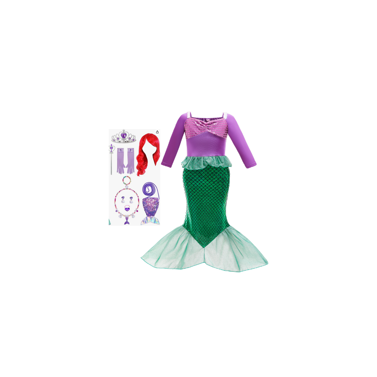 Esta fantasia de sereia para meninas é uma das mais completas e detalhadas, pois inclui 10 peças para conseguir um visual autêntico. Além do vestido de uma peça , o conjunto inclui uma peruca vermelha, bolsa espinha de peixe, tiara, varinha mágica, luvas combinando e um conjunto de joias de inspiração náutica . Disponível em vários tamanhos, é o presente perfeito para pequenos sonhadores que amam o mundo mágico das sereias e aventuras subaquáticas. Uma fantasia charmosa que fará qualquer garota brilhar!
